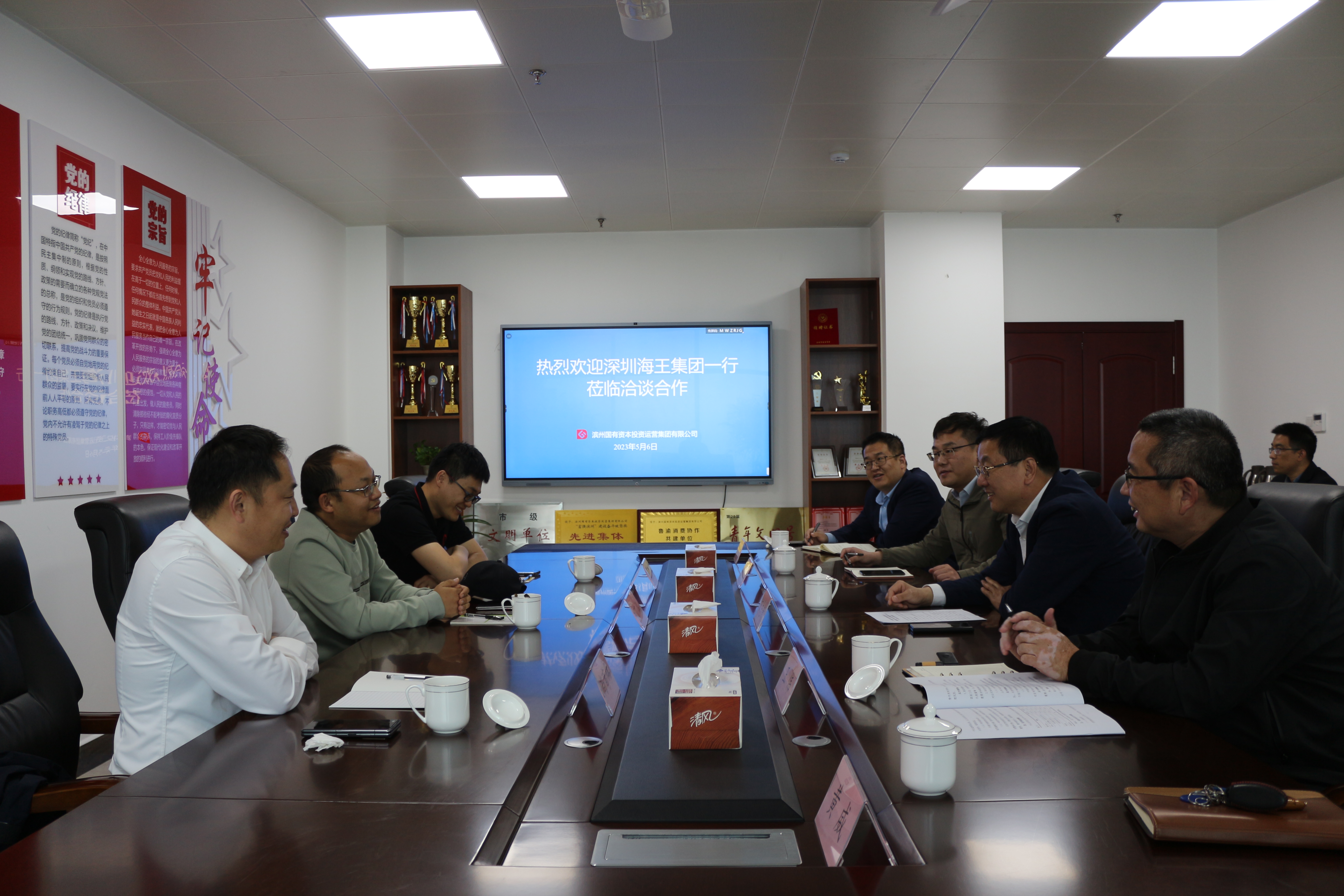5月6日,深圳海王集团总监丁鹏、深圳海王生物总监郭宇奇、滨州海王总经理尚育伟一行到国投集团洽谈业务合作,国投集团党委书记、董事长商志新,党委委员、董事王伟等领导参加洽谈交流会议。
